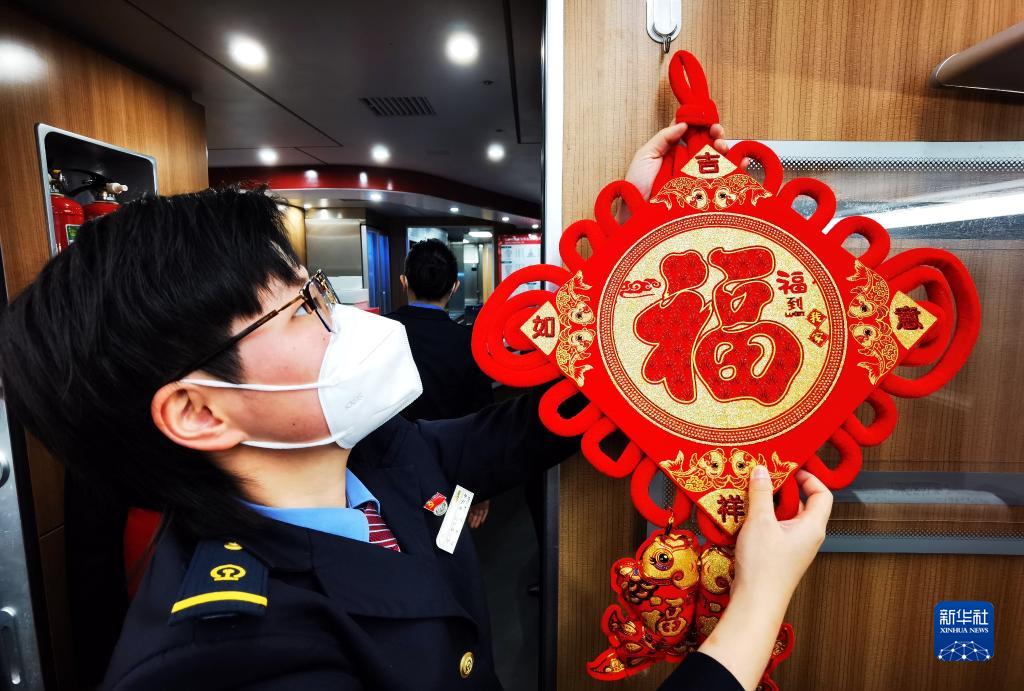 1月7日,乘務員在北京豐臺開往福州的D759次列車車廂里掛“?!弊?。