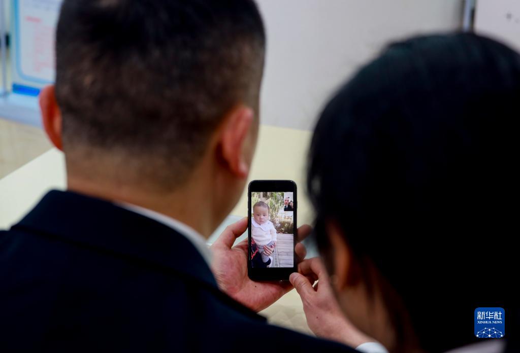 1月6日,重慶航空的機組工作區內,出任務的楊靜(右)和丈夫菅士博與孩子視頻通話。