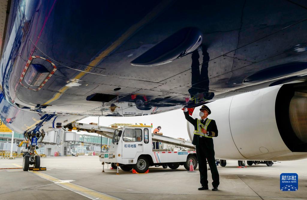 1月6日,重慶江北國際機場的停機坪上,機長菅士博對客機進行起飛前的繞機檢查。