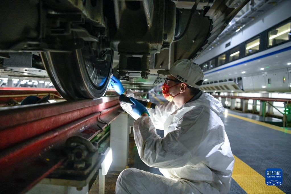 2023年春運于1月7日啟動。中國鐵路成都局集團有限公司貴陽車輛段貴陽北動車運用所的工作人員對動車組列車進行檢修、保養、清潔,確保春運期間列車運行安全和旅客乘車環境舒適。