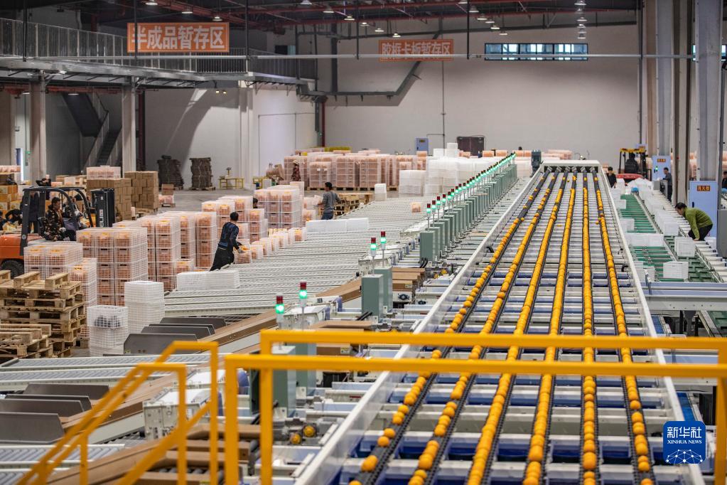 1月6日,在中國三峽柑橘(奉節臍橙)交易中心,全自動分揀線將臍橙自動分揀裝筐。