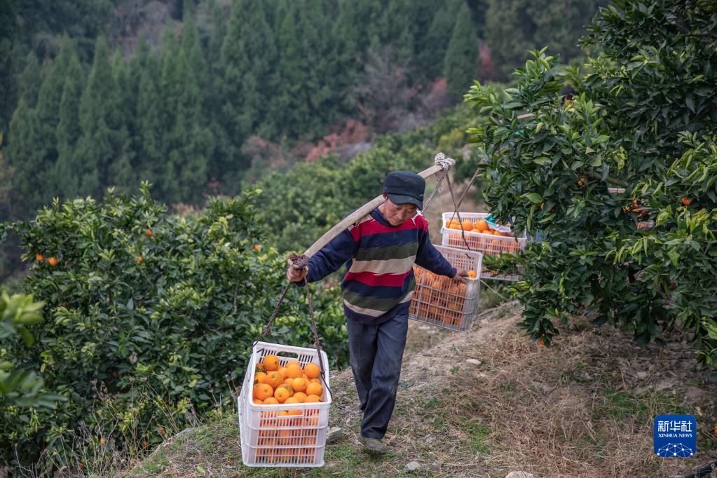 1月6日,在重慶市奉節縣白帝鎮八陣村,村民在挑運剛采摘的臍橙。