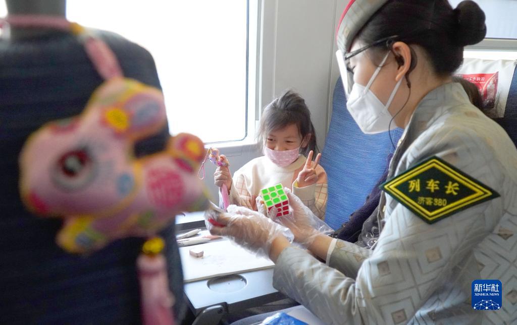1月7日,在G105次列車上,列車長馬文麗為一名小朋友的座位掛上粉色小兔標記并與小朋友互動。