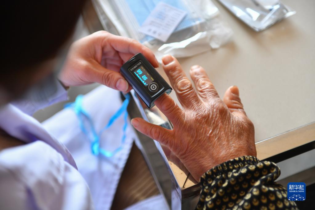 1月7日,醫護人員在湖南省湘潭市雨湖區姜畬鎮聯映村為老人檢測血氧飽和度。