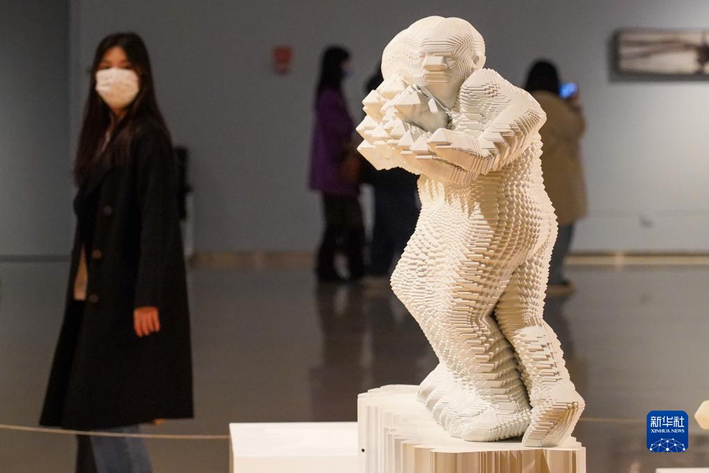 1月7日,觀眾在“2022濟南國際雙年展”上參觀藝術作品《陀螺舞》。