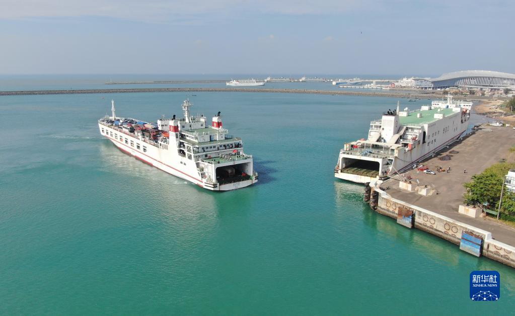 1月6日,在位于??诘幕浐hF路輪渡南港碼頭,粵海鐵1號輪渡正在??坎次唬o人機照片)。