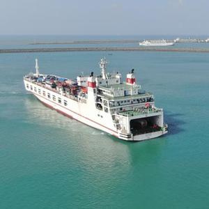 粵海鐵路輪渡是我國第一條跨海鐵路通道,跨越我國三大海峽之一的瓊州海峽?;浐hF路輪渡于2003年1月7日開通營運,海上航線距離約12.5海里(相當于22.5公里),航行時間約60分鐘?,F有四艘萬噸級渡輪,較大的兩艘總噸位達2.3萬噸。渡船下層甲板載運火車,中層甲板載運汽車,上層艙室載運旅客。