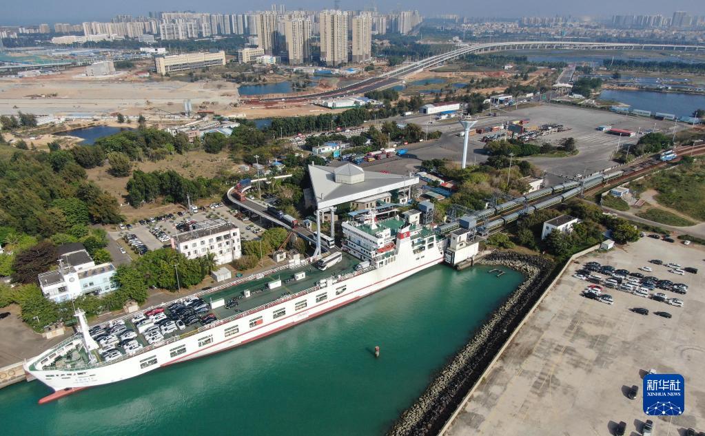 1月6日,在位于??诘幕浐hF路輪渡南港碼頭,粵海鐵1號輪渡??坎次徊⒀b載列車(無人機照片)。