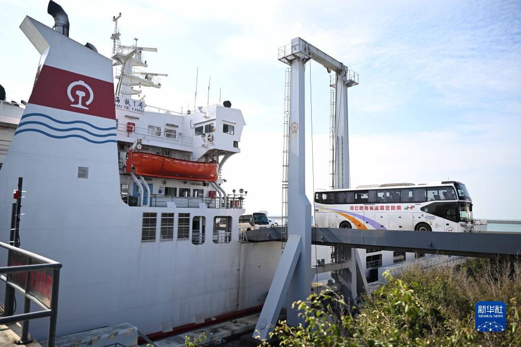 1月6日,在位于??诘幕浐hF路輪渡南港碼頭,車輛駛離粵海鐵1號輪渡。