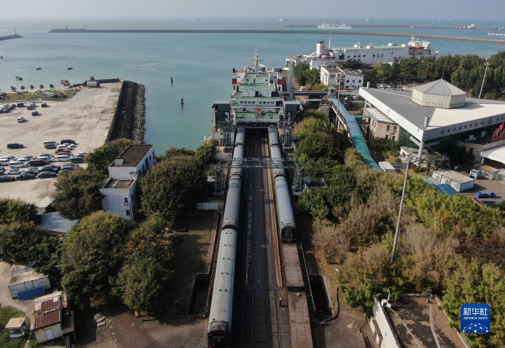 1月6日,在位于??诘幕浐hF路輪渡南港碼頭,列車解編后駛入粵海鐵1號輪渡(無人機照片)。