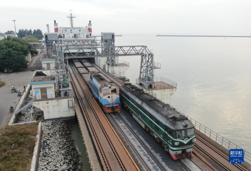 1月6日,在廣東徐聞的粵海鐵路輪渡北港碼頭,機車正在牽引粵海鐵1號輪渡上的列車駛出(無人機照片)。