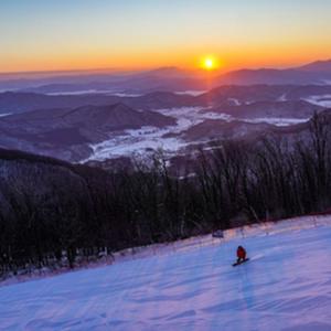 在吉林省吉林市萬科松花湖度假區,滑雪愛好者在清晨第一縷陽光下滑雪(2023年1月1日攝)。