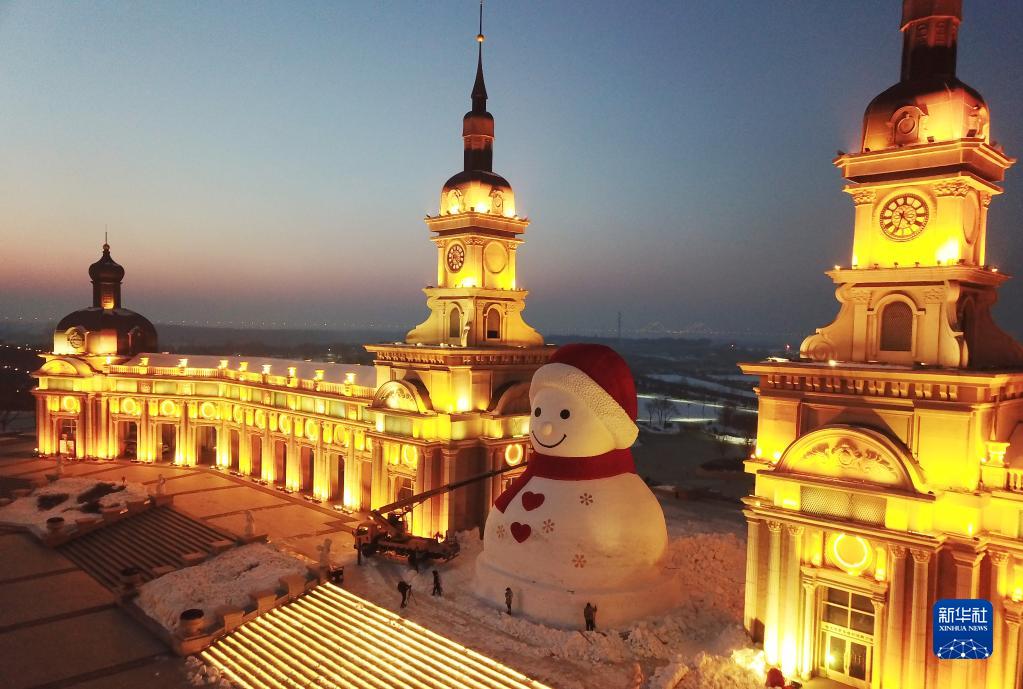 在哈爾濱松花江畔,工人進行大雪人收尾工作(2023年1月4日攝,無人機照片)。