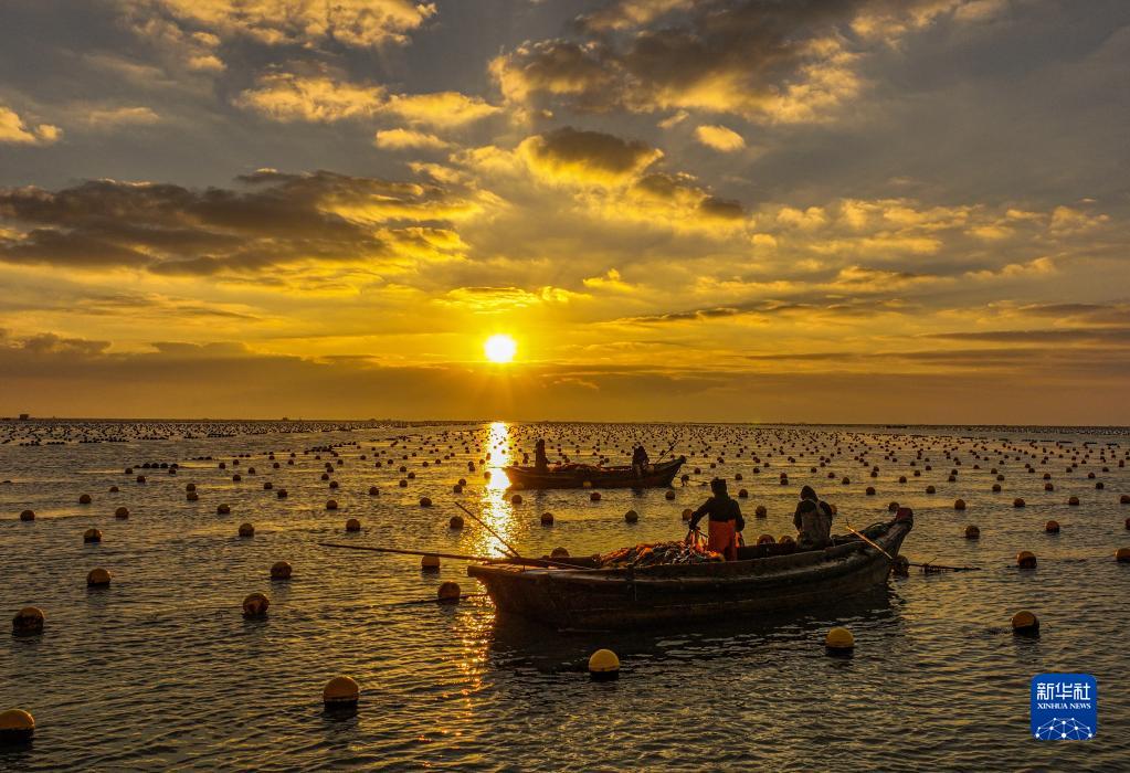 在山東省榮成市尋山街道愛倫灣海洋牧場,漁民駕駛漁船開展生產作業,呈現一幅“海上冬耕”的畫面(2023年1月3日攝,無人機照片)。
