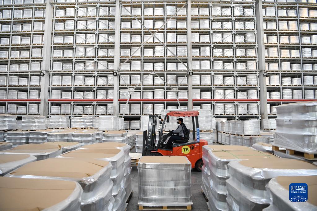 1月6日,沙河市一家玻璃制品生產企業的工人駕駛叉車運輸玻璃纖維產品。