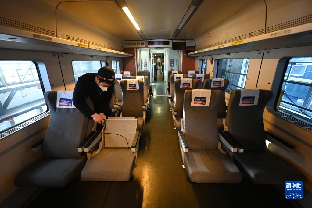1月7日,在中國鐵路南昌局集團有限公司福州動車段,工作人員在動車組列車內檢修小桌板。