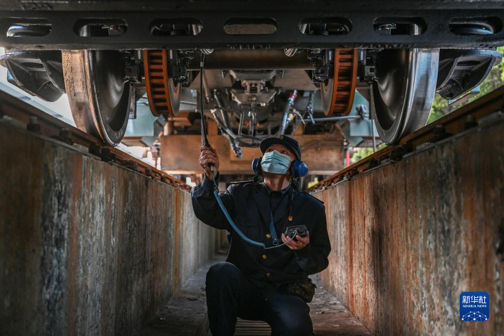 1月7日,在中國鐵路南昌局集團有限公司福州車輛段,工作人員檢查綠皮火車的制動裝置。