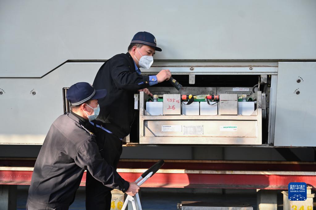 1月7日,在中國鐵路南昌局集團有限公司福州動車段,工作人員在檢修動車組列車的蓄電池。
