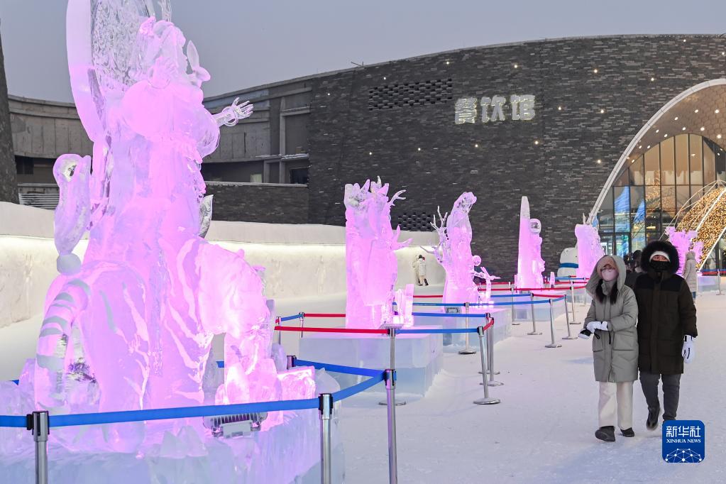 1月5日,游客在哈爾濱冰雪大世界園區欣賞冰雕作品。