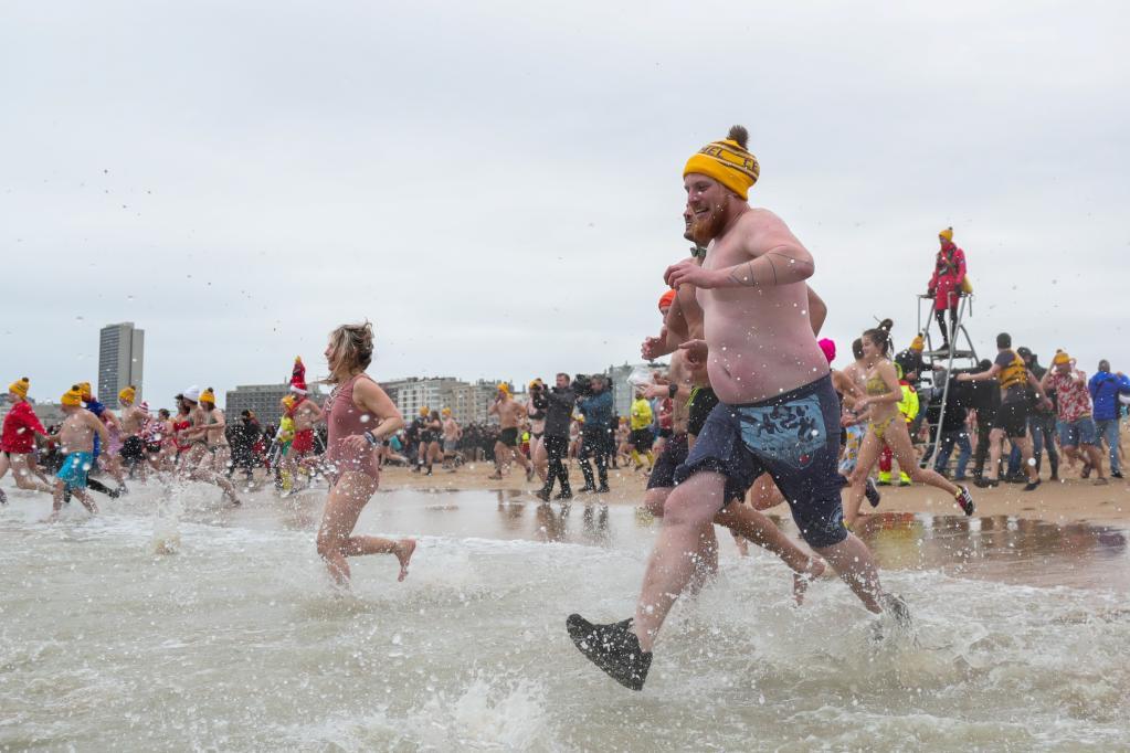 當日,比利時港口城市奧斯坦德舉行傳統的“跳北海慶新年”活動,數千參加者身著各式服裝跳進北海。人們認為冰冷的海水能讓人精神煥發,擁抱健康的一年。