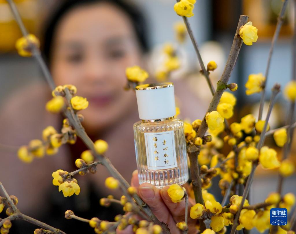 1月7日,在重慶市北碚區靜觀鎮一家農業專業合作社,銷售員在展示合作社生產的臘梅香水。