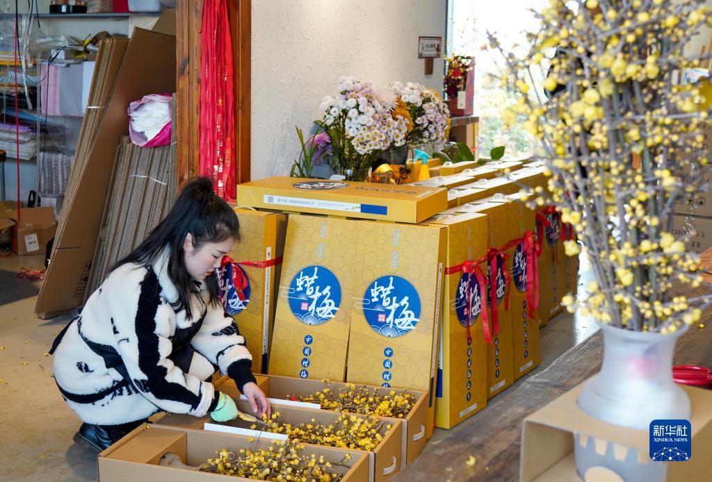 1月7日,在重慶市北碚區靜觀鎮一家創意工坊,一名插花師將臘梅花裝入快遞盒。