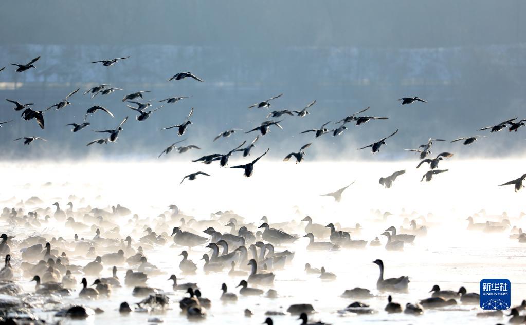 近日,在遼寧省沈陽市渾河上,萬余只鴻雁、赤麻鴨、鴛鴦等候鳥遷徙來此棲息。它們成群結隊在河面上嬉戲、休憩,成為冬日里一道美麗的風景線。
