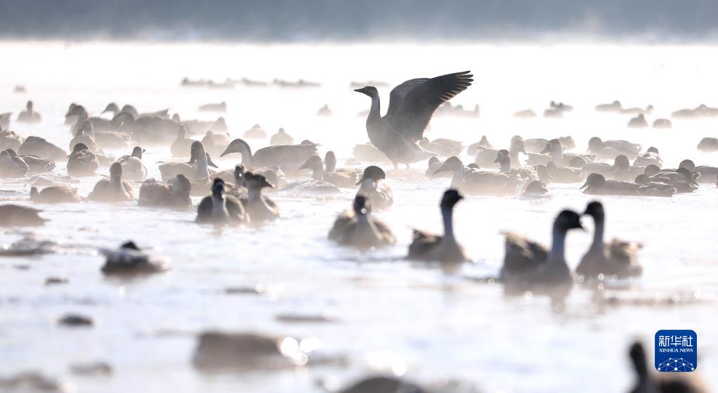 近日,在遼寧省沈陽市渾河上,萬余只鴻雁、赤麻鴨、鴛鴦等候鳥遷徙來此棲息。它們成群結隊在河面上嬉戲、休憩,成為冬日里一道美麗的風景線。