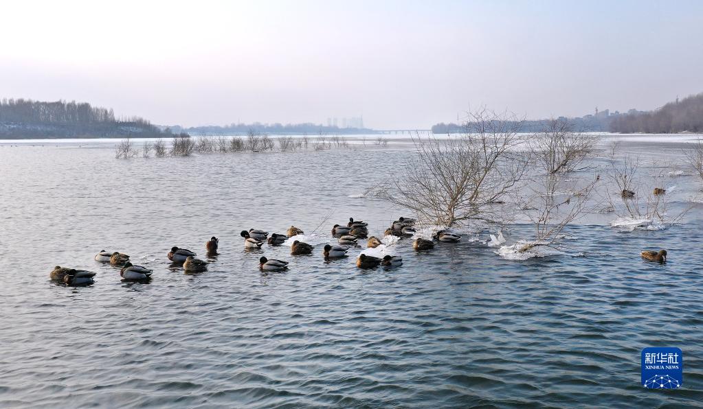1月5日,候鳥在沈陽渾河棲息、覓食(無人機照片)。