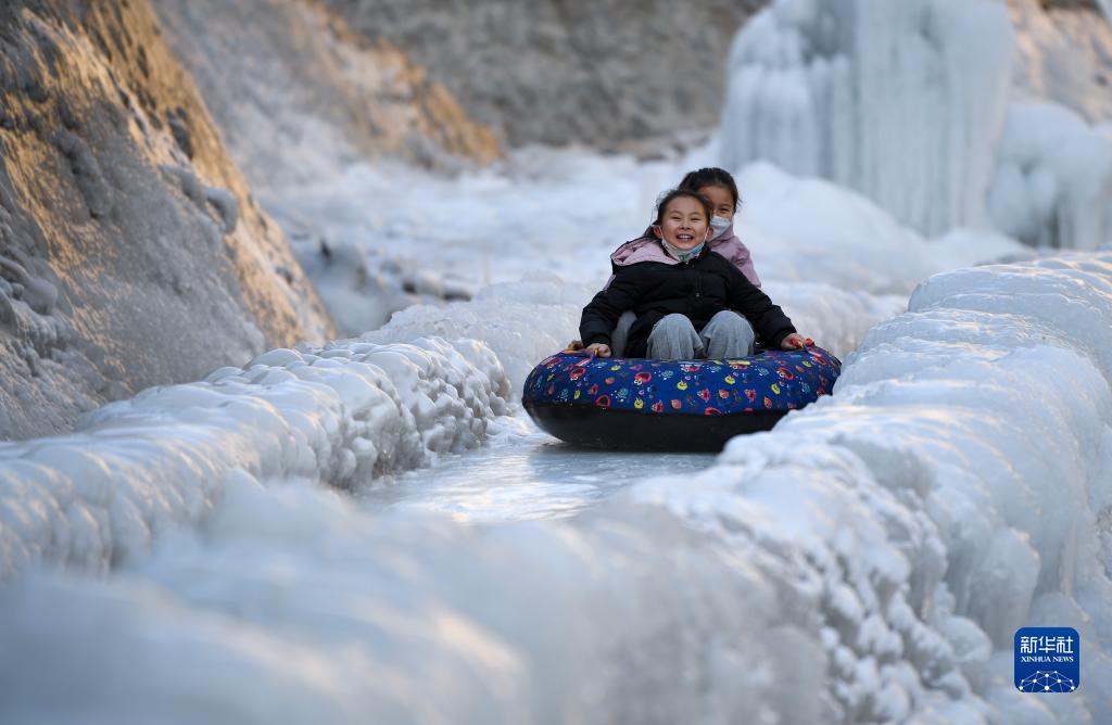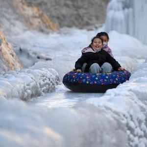 1月7日,小朋友在寧夏銀川市賀蘭山巖畫景區體驗冰道雪圈速滑。