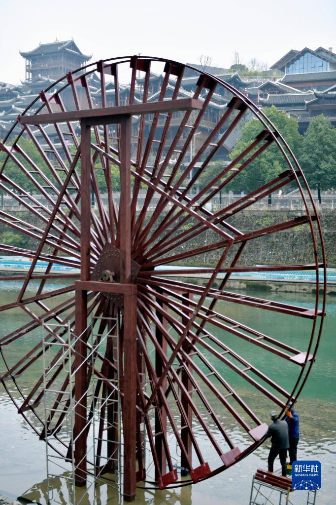 春節臨近,在湖北省恩施土家族苗族自治州宣恩縣城興隆老街前,多架大型農耕水車正加緊安裝。安裝好的水車,將成為展示少數民族農耕文化的風景線。