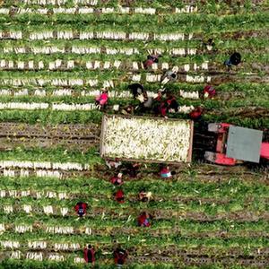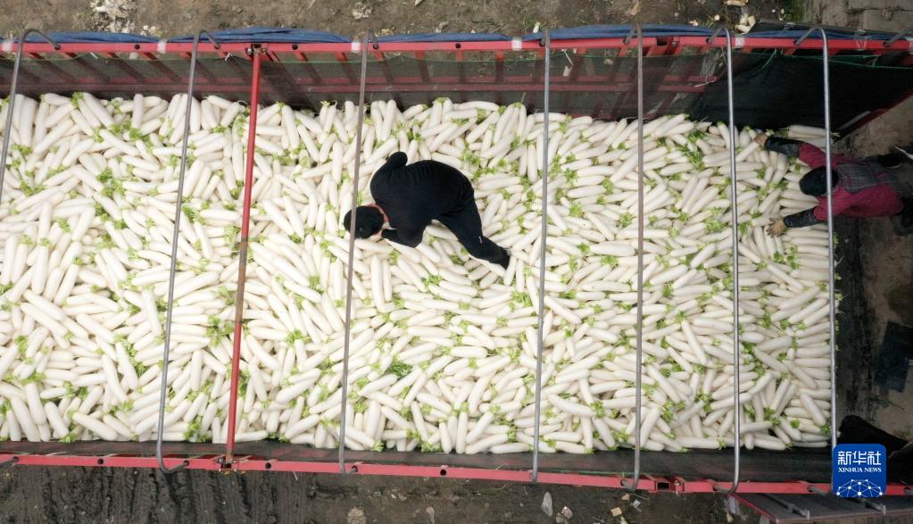 1月8日,村民在四川省眉山市青神縣青竹街道沙河村裝運反季節蘿卜(無人機照片)。