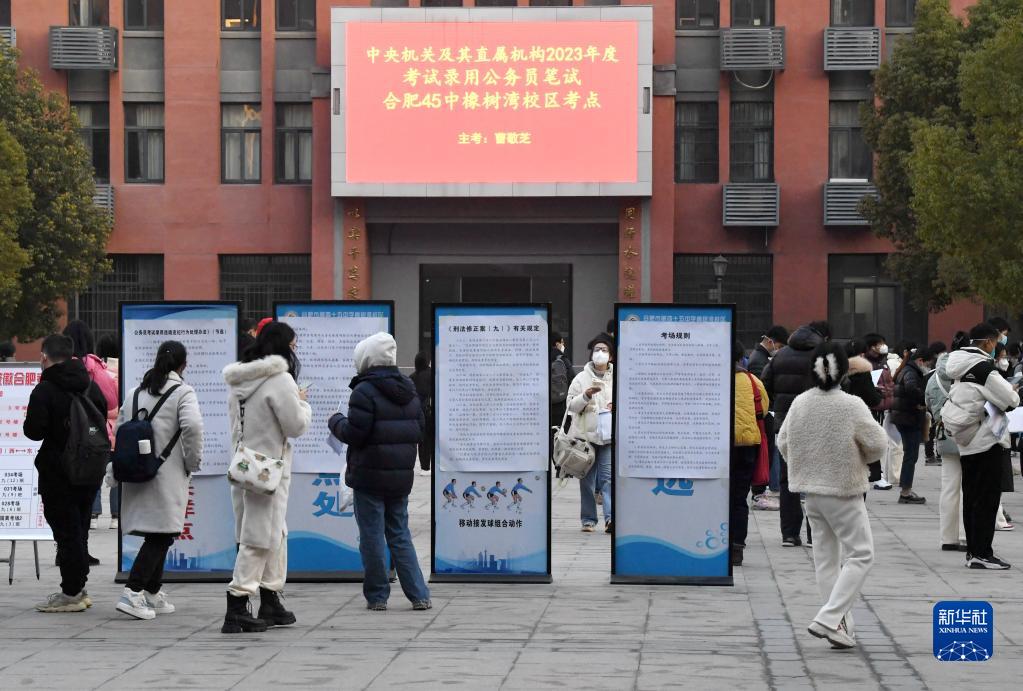 當日,中央機關及其直屬機構2023年度考試錄用公務員公共科目筆試舉行。 這是1月8日,在安徽省合肥市第四十五中學橡樹灣校區考點,考生準備入場參加公共科目筆試。