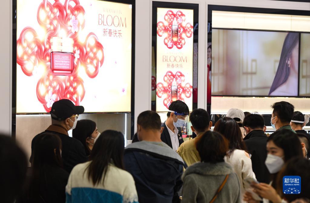 1月8日,游客在中免集團??谌赵聫V場免稅店排隊結賬。