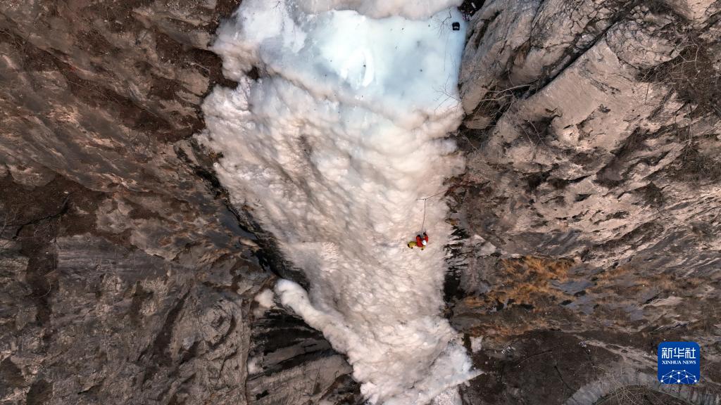 近日,河北邢臺市云夢山景區內的七疊瀑形成壯觀冰壁,吸引不少游客前來游玩。攀冰愛好者借助專業工具,在專職教練的指導下體驗攀冰,成為太行山冬日里一道別樣風景。