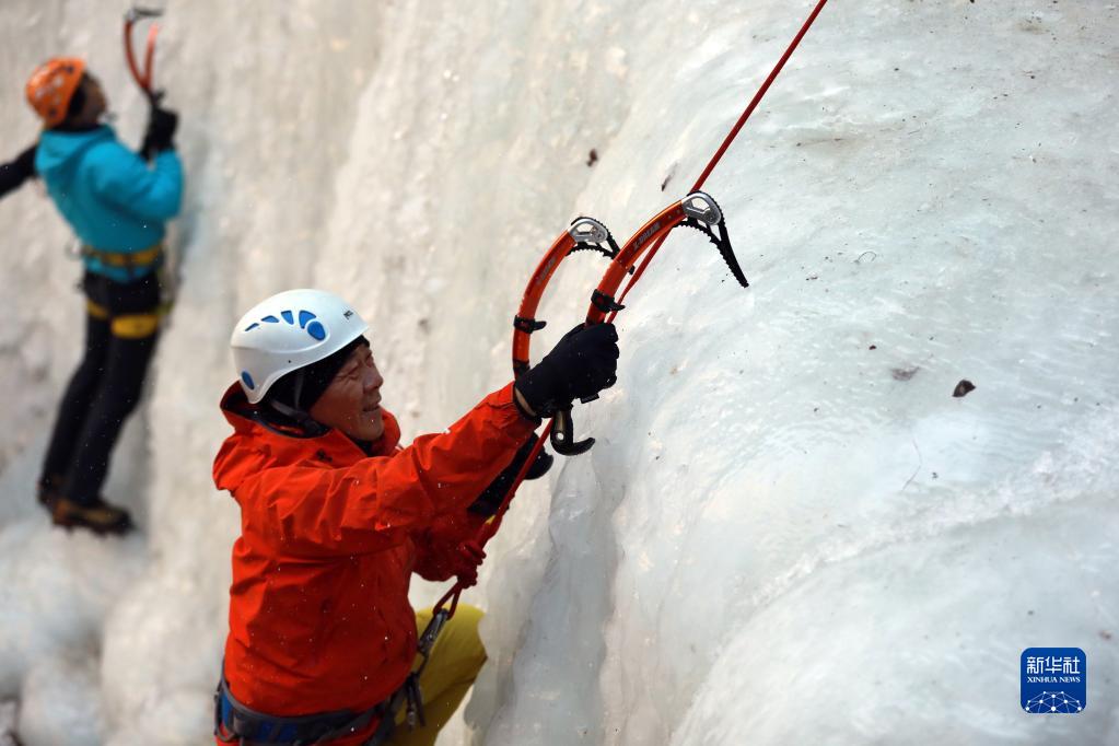 近日,河北邢臺市云夢山景區內的七疊瀑形成壯觀冰壁,吸引不少游客前來游玩。攀冰愛好者借助專業工具,在專職教練的指導下體驗攀冰,成為太行山冬日里一道別樣風景。