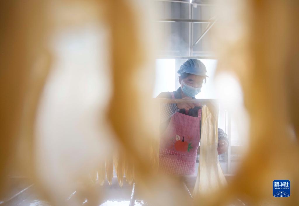 春節臨近,湖南省永州市江華瑤族自治縣涔天河鎮的腐竹加工廠忙著生產手工腐竹,供應節日市場。