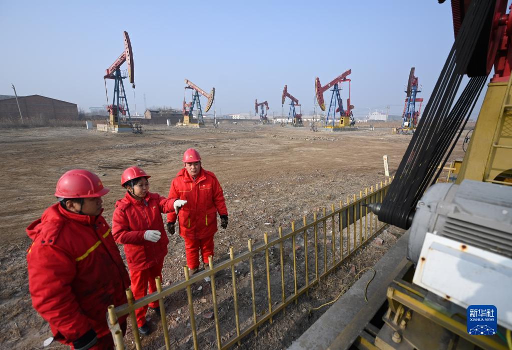 尤立紅(中)和同事在大港油田第五采油廠第一采油作業區查看抽油機皮帶磨損情況(1月6日攝)。