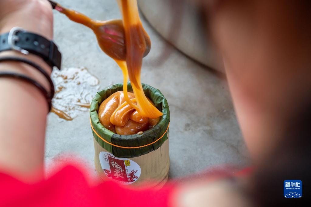 1月8日,在馬來西亞首都吉隆坡以北約70公里的新古毛,工作人員把蒸好的年糕盛到竹筒里。