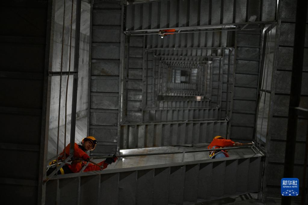 1月8日,在福建平潭公鐵兩用跨海大橋,福州工務段工作人員在大橋主塔內部進行敲擊檢查作業。