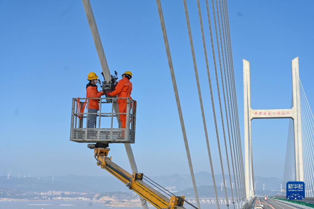1月8日,在福建平潭公鐵兩用跨海大橋,福州工務段工作人員通過升降裝置上升到斜拉索處安裝橋梁纜索智能檢測機器人。