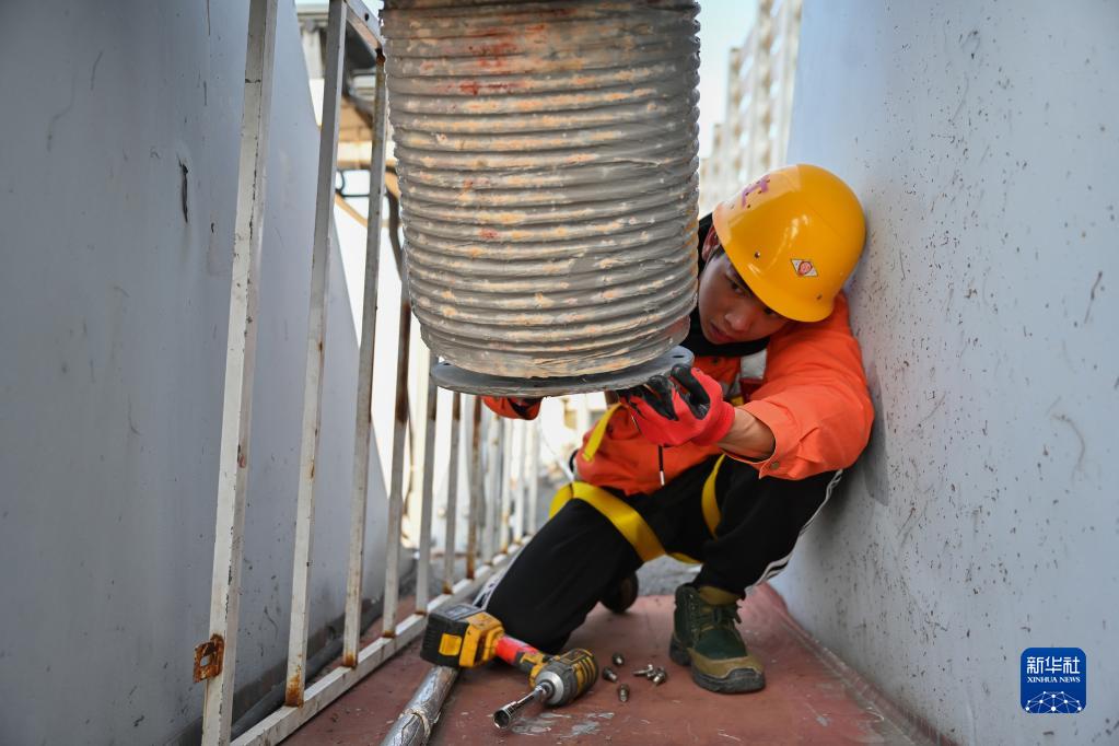 1月8日,在福建平潭公鐵兩用跨海大橋,福州工務段工作人員在檢修斜拉索錨頭封蓋。
