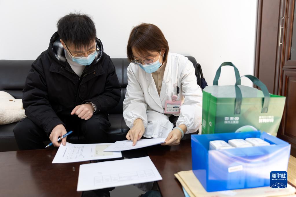 1月8日,在上海市閔行區顓橋社區衛生服務中心,醫務科科長王莉蕓(右)與護理院工作人員核對新冠小分子藥配送清單。新華社記者 王翔 攝