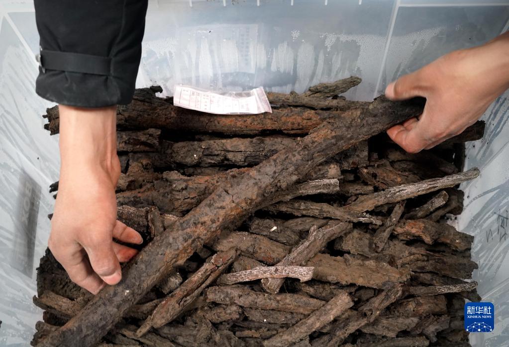 考古工作人員在整理河南商丘宋國故城遺址收集的桑樹枝(1月6日攝)。