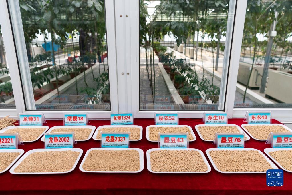 這是北大荒建三江國家農業科技園區內展示的水稻和大豆品種(1月9日攝)。