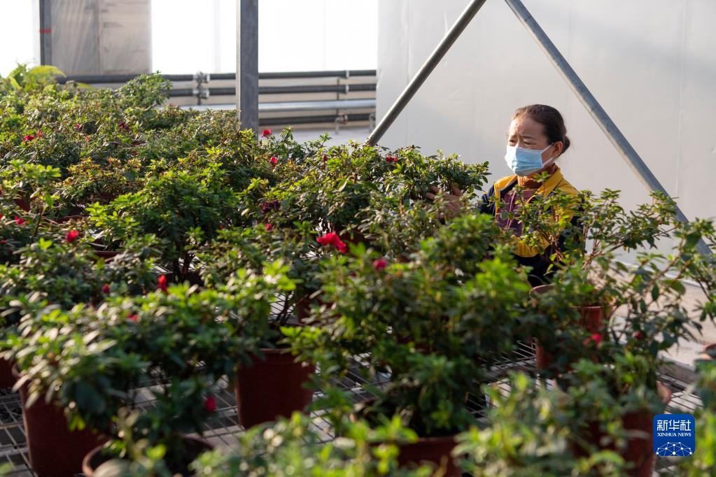 1月9日,工作人員在北大荒建三江國家農業科技園區內摘除花卉的枯葉。