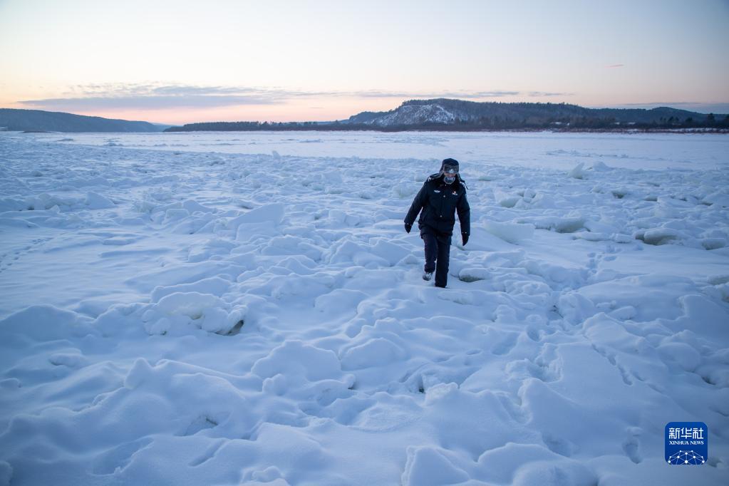 1月8日,史先強在洛古河村旁封凍的黑龍江江面上進行邊境巡邏。