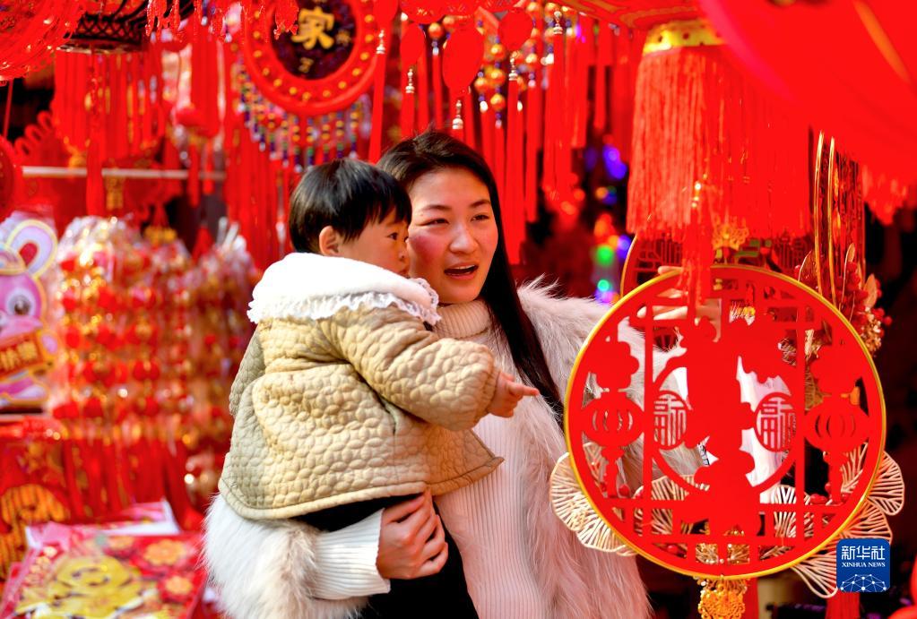 1月9日,市民在安徽省亳州市譙城區一家年貨市場選購新春飾品。