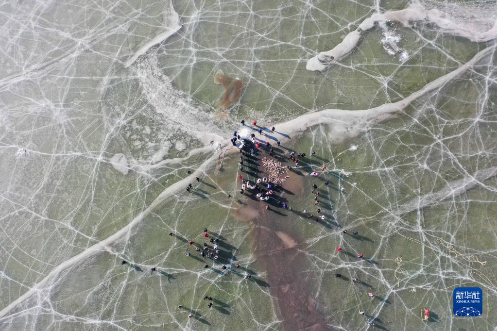 這是土默特左旗哈素海的冬捕現場(1月9日攝,無人機照片)。