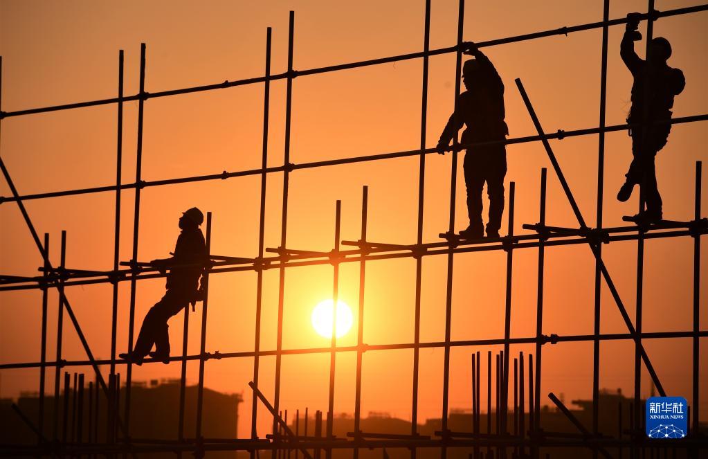 2022年1月1日,在河北雄安新區容西安置房項目D標段施工現場,中鐵上海工程局工人在新年第一縷陽光的照耀下工作。